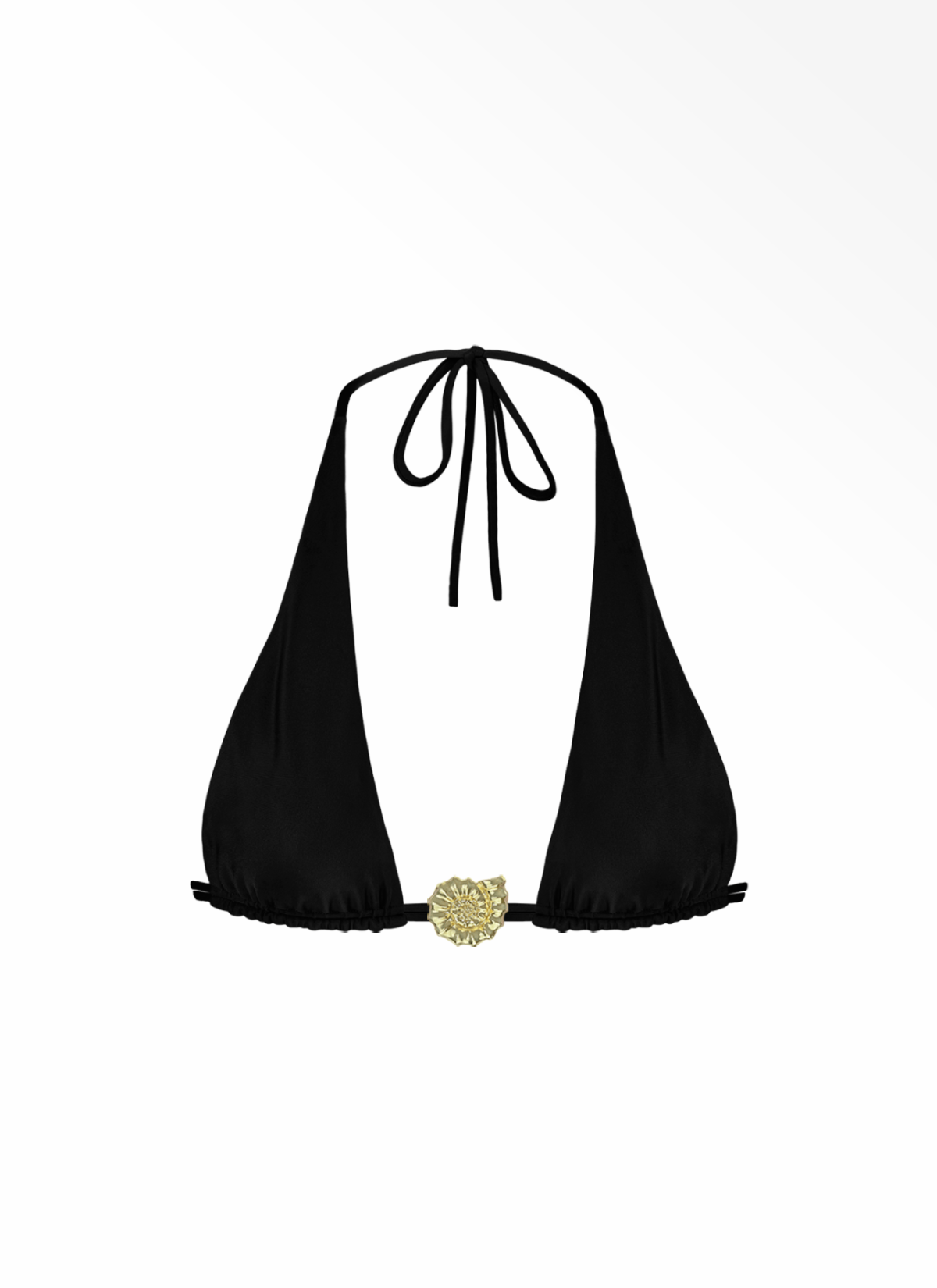 The Camila in Black is a halter style bikini top with a vintage inspired gold shell hardware at the center. Featuring two strap band for extra support, adjustability around the neck and clasp back closure.