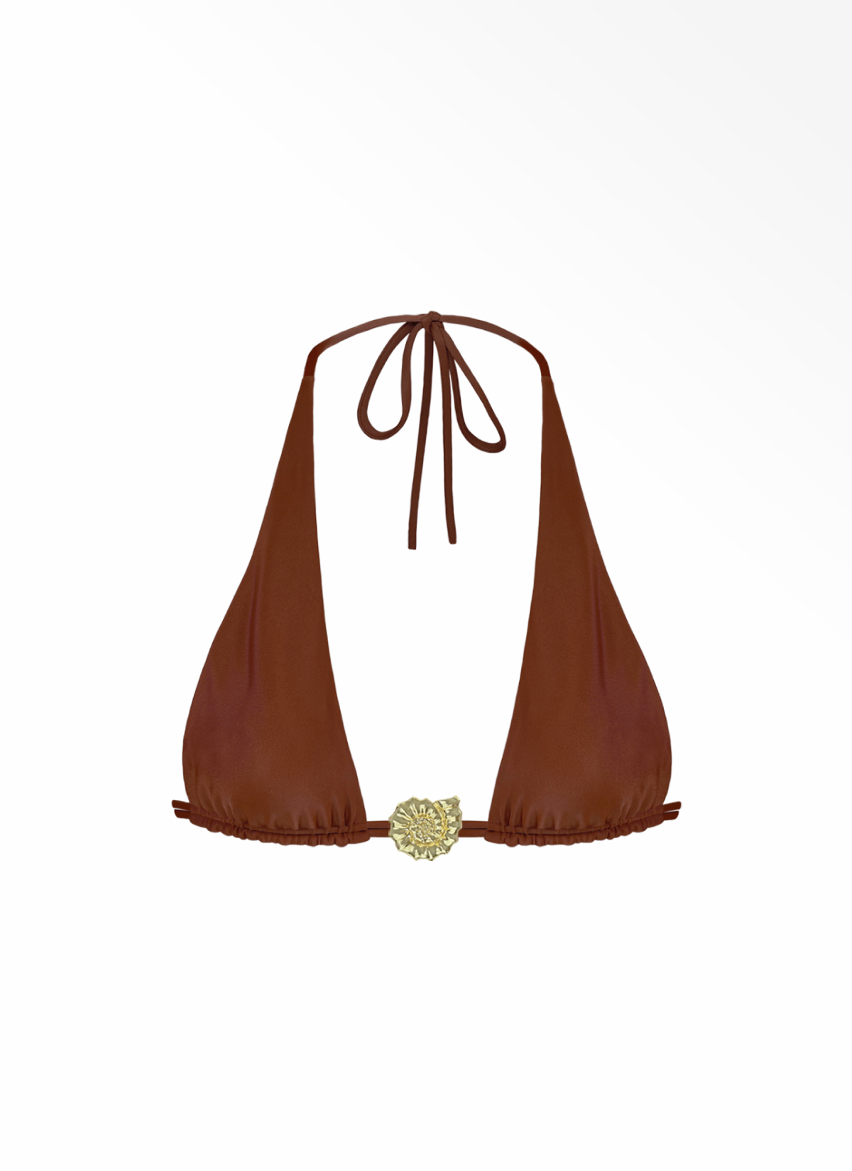 The Camila in Black is a halter style bikini top with a vintage inspired gold shell hardware at the center. Featuring two strap band for extra support, adjustability around the neck and clasp back closure.