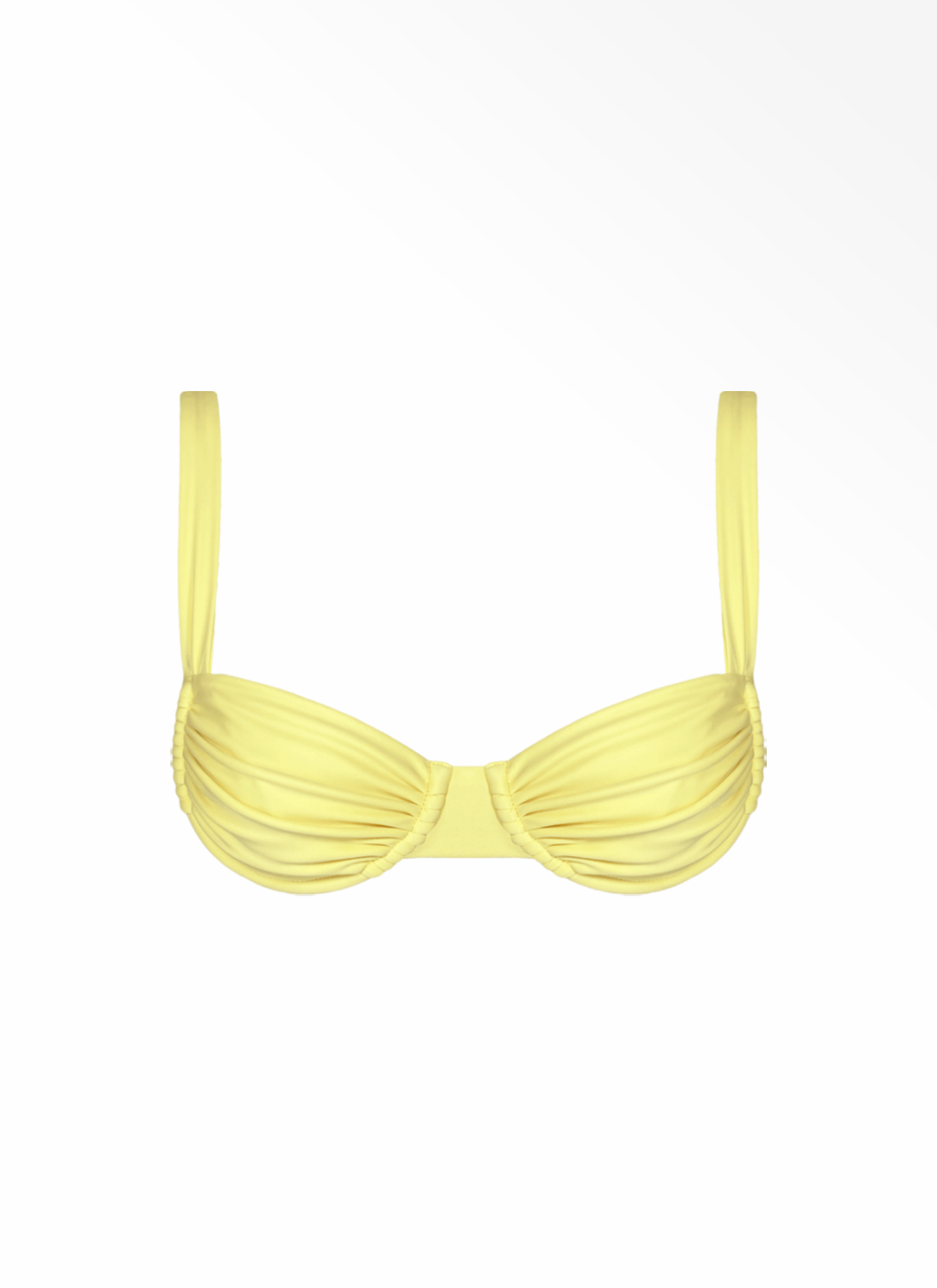The Celene in Limonche is balconette bikini top with sculpted underwire cups that shapes the bust. Features our signature ruched detailing along the cups, adjustable thicker straps and back tie for full adjustability.