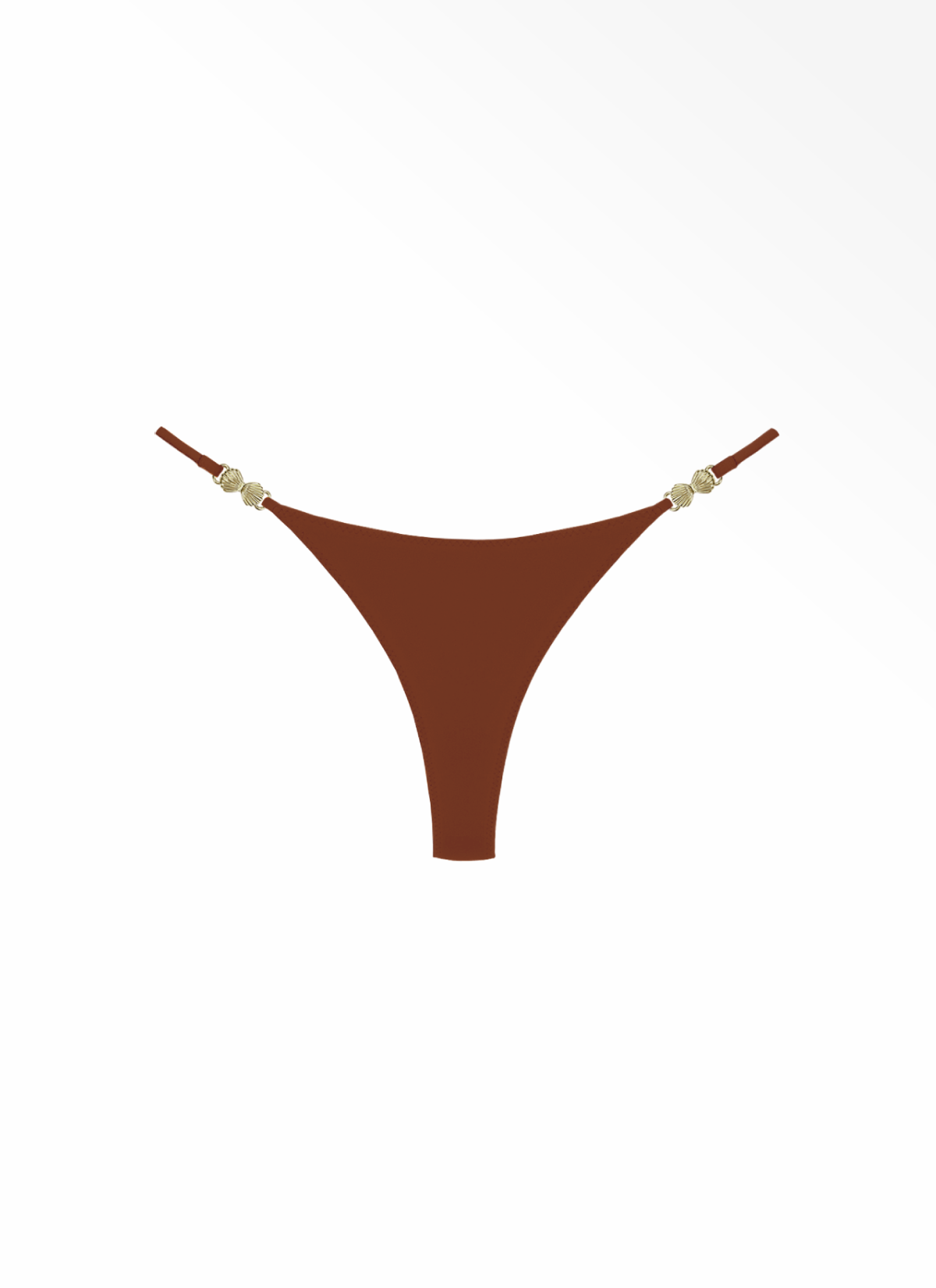The Dolce in Tan is a cheeky brazilian bikini bottom featuring vintage inspired gold shell hardware detailing at the hips and a flattering V-cut at the back.