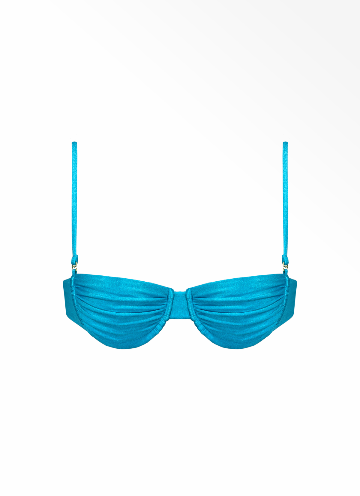 Holiday top in Azure is a minimalistic take on our signatue Celine top. Ultra femenine and elevated with elements such as thin, adjustable straps, custom gold clasp in the back and luxurious shine it's giving us all the 90's vibes. It supports and lifts with molded underwire cups featuring hand ruched cup detail. Straps can be fully removed for a bandeau look.