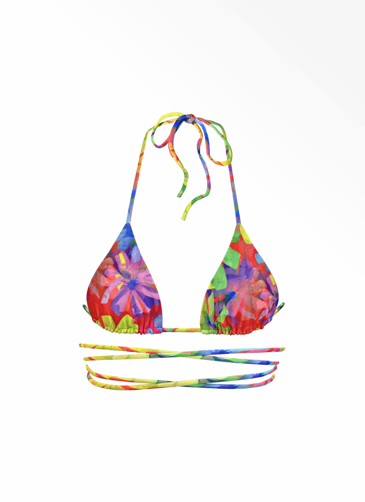 The Soleil wrap around top in Copacabana is a playful version of a classic triangle top. Play around with the extra long strings and criss cross tie them around your midssection for the ultimate Brasileira look. We've spiced it up this season with our new exclusive print.