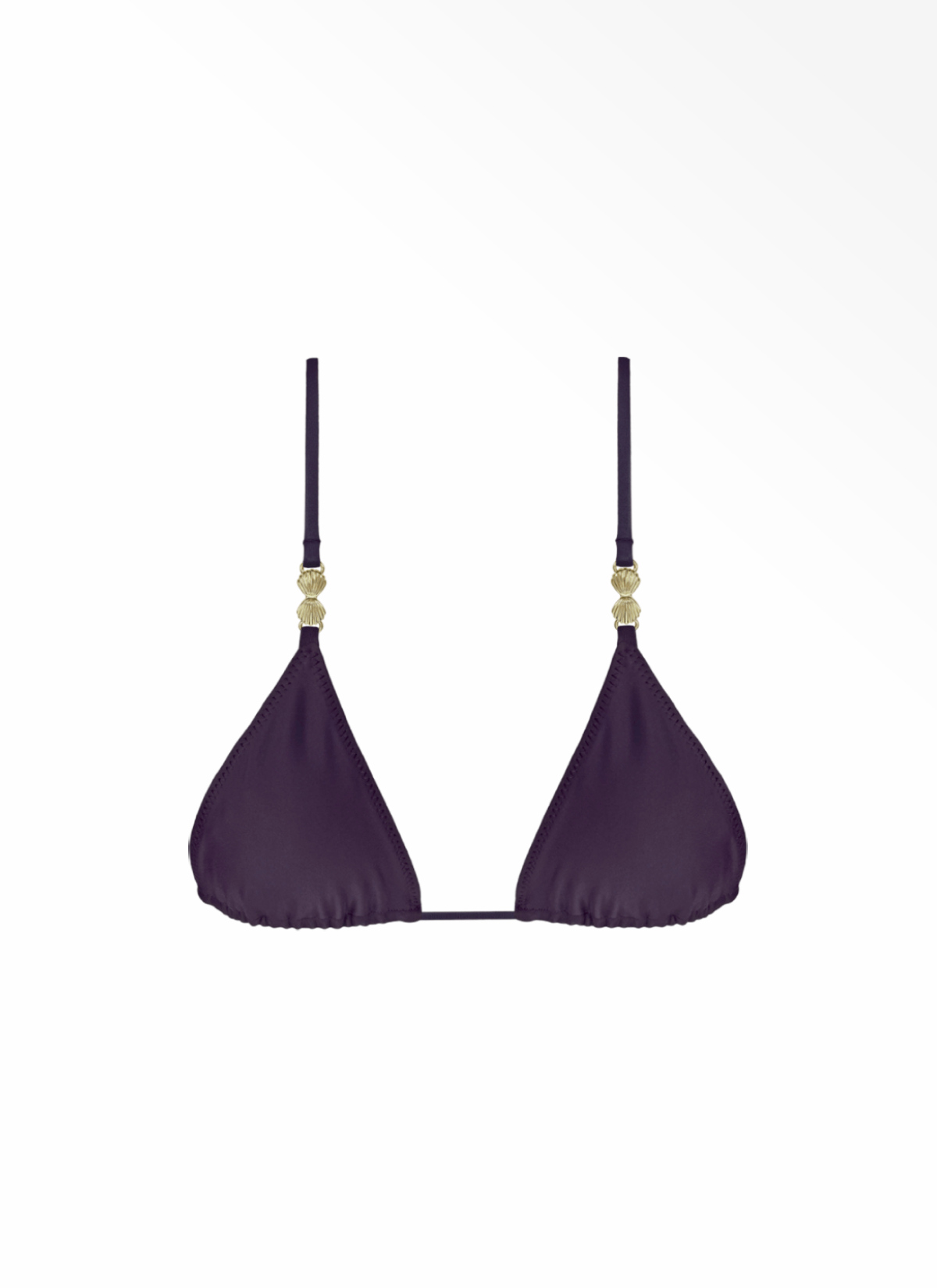 The Mia in Chianti is an elevated classic triangle top with adjustable over-the-shoulder straps, adorned by vintage inspired gold shell accessories and adjustable back tie.