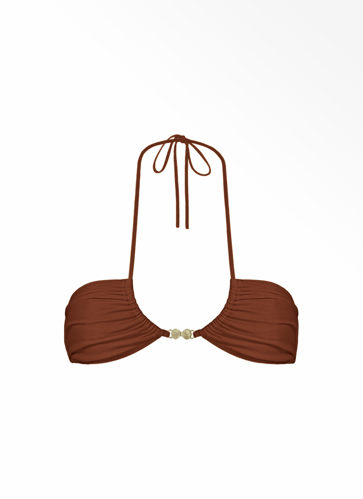 The Stella in Tan is halter bandeau style top that lifts and shapes your bust. Featuring adjustable ruching along the cups and neck tie that can be worn in various different ways. Adorned by vintage inspired gold shell feature at center.
